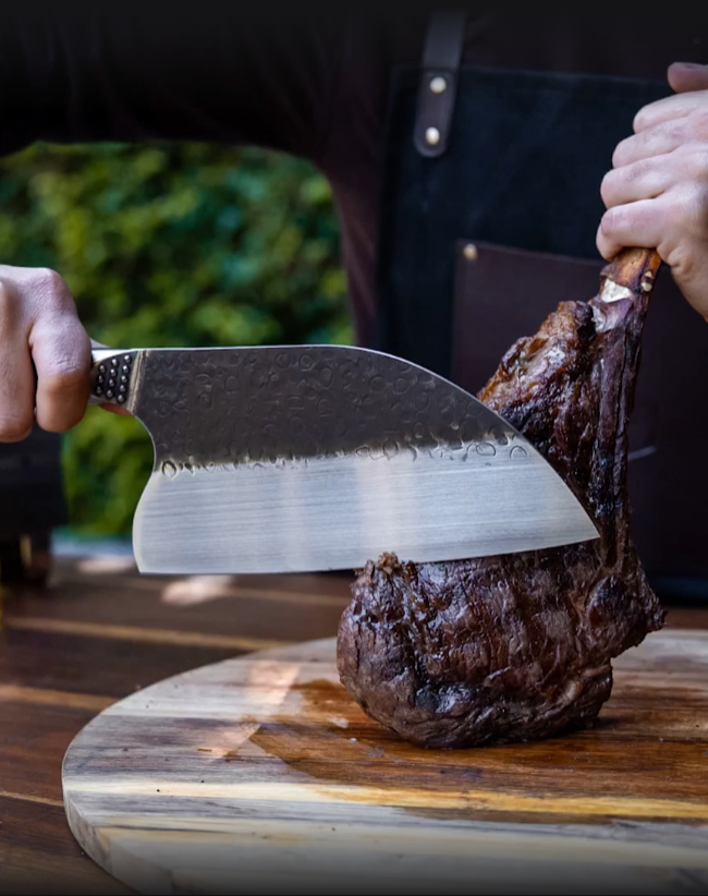 A Razor-Sharp CleaverThe Butcher showcases a razor-sharp german steel blade that cuts through tough everything with ease. Designed for impeccable balance, the knife's ergonomic handle and effortless weight make precision cuts a breeze.The Valhalla Butcher Knife is the ultimate combo between precision, flexibility, and sharpness.